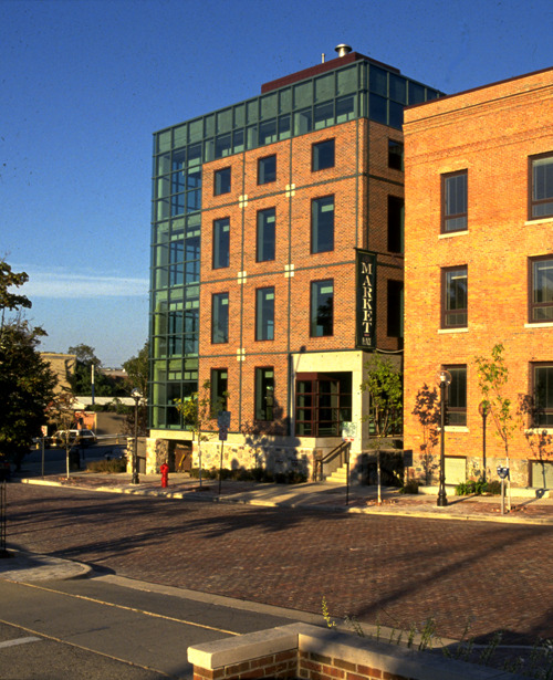 303 Detroit Street, known as the Market Place building, has long been a Kerrytown landmark. Originally constructed in 1856 as an Agricultural Hall, the brick warehouse once housed agricultural implements before undergoing a major rehabilitation in 1988, when a contemporary glass and brick addition created the office and retail complex that stands today. The building fronts Detroit Street, Catherine Street, and Fourth Avenue, with its distinctive silo stair tower and central garden court becoming part of the Farmers Market pedestrian experience. Now, local developer MAVD, together with builder Huron Contracting, is leading a transformation to convert the four-story complex into an all-residential community of 18 luxury condominiums. Each building will have an added 5 th story to create two brand-new, spectacular penthouses, each fully customizable with private balconies, palatial 9-foot ceilings, and on-site parking in a carousel with access off Fourth Avenue.